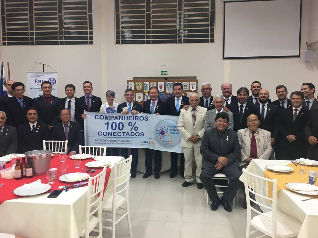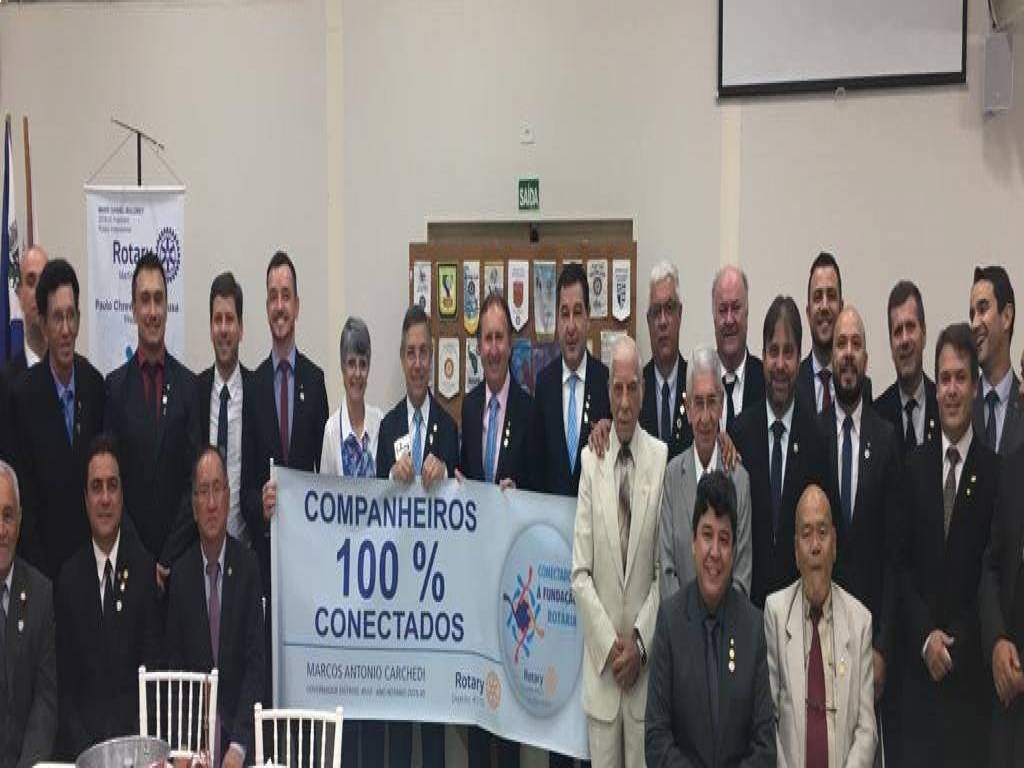 O momento foi registrado com a FOTO de exibição da faixa (banner) da campanha das metas do ano 2019-20, intitulada "COMPANHEIROS 100% CONECTADOS” da campanha “CONECTADO A FUNDAÇÃO ROTÁRIA”.